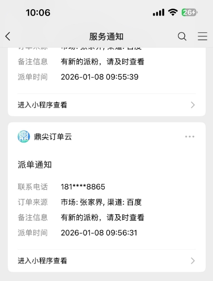不管是买的线索,还是巧舱、飞鱼、旅盟私域宝。。。API自动下发的....都可以实时通知微信里面。