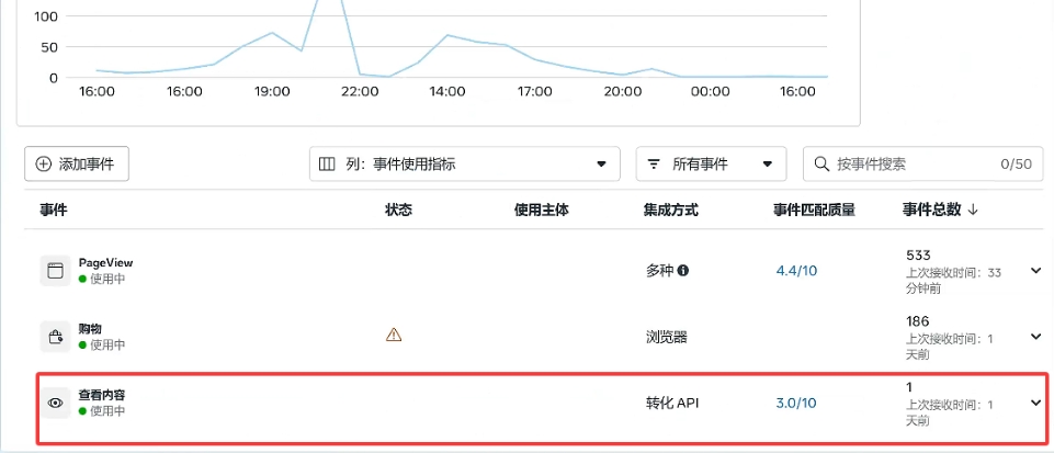 测试事件,回传,即可看到集成方式为:事件API。