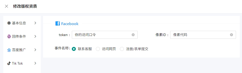 获取访问口令 和 像素代码 一起,填写到落地页系统,版权资质里面,token中。